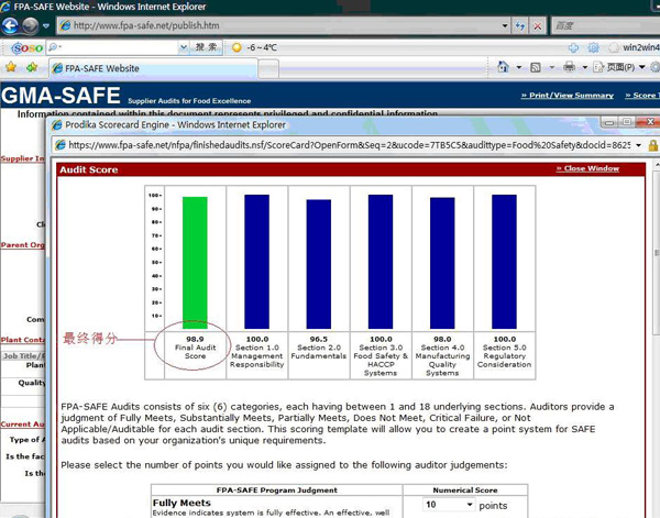 10月26日——27日,受美国国家食品加工协会的委派,美国FPA-SAFE公司评审组到秦安公司做GMA-SAFE认证审核。近日,从FPA-SAFE官方网站上得知秦安公司的GMA-SAFE认证综合评审获98.9的高分。