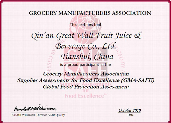 作为一家获得GMA-SAFE认证的浓缩果汁加工企业,长城果汁一贯重视产品质量和食品安全,并将此作为企业向消费者承担的责任。天水长城果汁(集团)有限公司是由兰州长城电工股份有限公司控股的生产、销售浓缩苹果汁的现代化企业。生产线全套设备均从德国、意大利、瑞士等国引进,系国际同行业最先进的加工设备。产品全部出口澳大利亚、欧盟、美国、加拿大、俄罗斯、东南亚等16个国家和地区。企业相继通过了美国HACCP质量体系认证、欧洲果汁保护协会SGF认证、犹太KOSHER结食认证。并多次获得国内国际荣誉及奖项,是国家级农业产业化重点龙头企业,国家扶贫龙头企业,全国农业产业化示范企业,甘肃省农产品重点骨干企业,在全国同行业中排名第六位。长城果汁作为一家农产品出口企业,产品在进入每个国家和地区时都要经过当地的资格审查。此次获得GMA-SAFE认证体现了长城果汁在质量安全方面的严格自我要求和对国际标准的遵守。