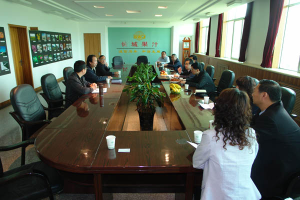 公司董事长柳军民、党委书记王根成、副总经理秦小强陪同孙行长一行考察组在二楼会议室亲切座谈。柳军民董事长向大家介绍了长城果汁的发展历程,公司目前的生产经营情况及今后发展展望。