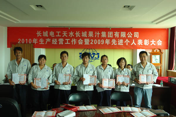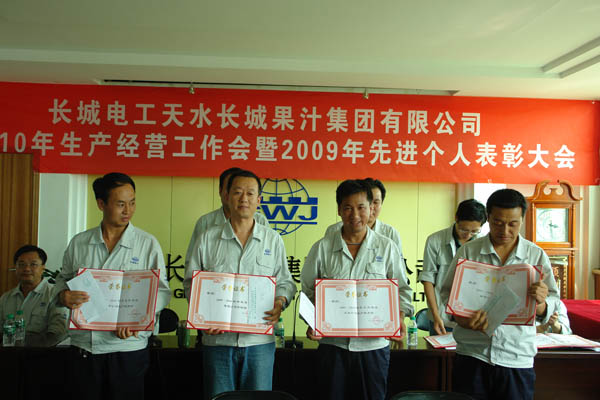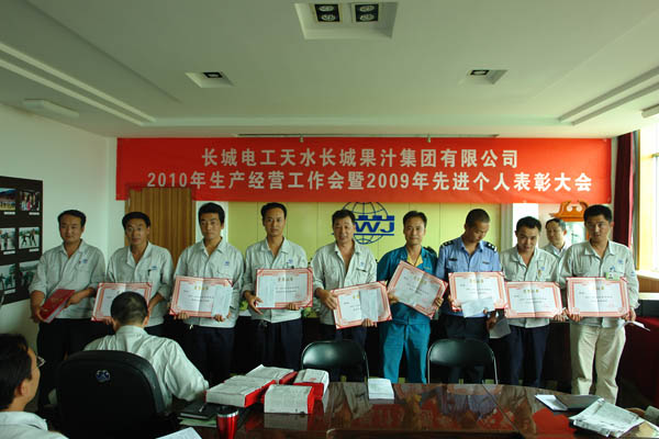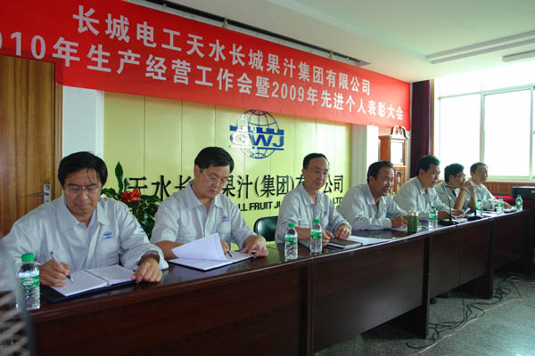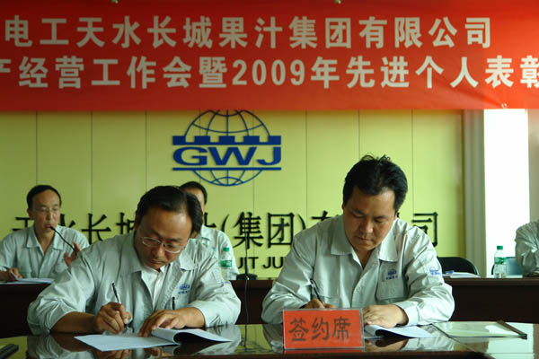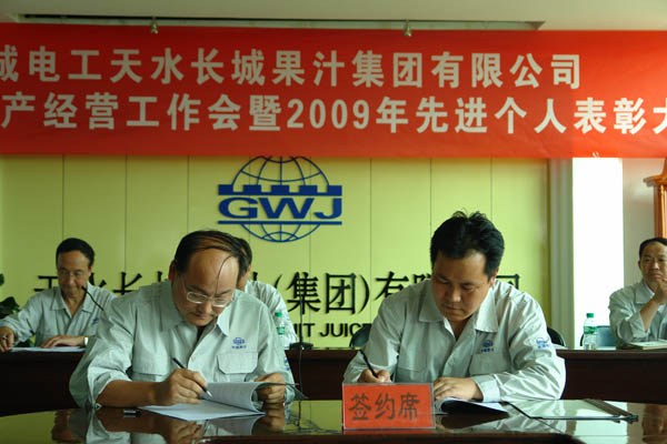 王小宏总经理分别与四个子公司经理签订了《2010年度榨季生产经营目标考核责任书》。 柳军民董事长从认真做好“十二五”发展规划,全面贯彻公司整体发展战略、正确认识预防腐败重要意义,全面落实公司“三重一大”实施细则等方面作重要讲话。他首先分析了市场形势,对于如何做好2010榨季生产经营工作,提出了要求:一是市场理念的转变,要建立健全市场服务体系,提高售前、售中和售后服务。二是做好从产品的质量、过程的控制、差异化、产量的要求及外协加工等方面的工作,以推动公司2010榨季生产经营目标任务的完成。 党委书记、工会主席王根成宣读了公司党政表彰决定。分别对2009年度先进集体、个人进行了表彰奖励。 王根成书记指出,今年果汁行业的形势不容乐观,企业发展和生产经营任务繁重而艰巨,本次会议对2010榨季生产经营各项工作进行了周密的安排和部署,我们一定要按照公司提出的“1、2、3、3、3”的2010榨季生产经营指导思想认真贯彻学习落实,在公司党委、董事会的正确领导下,强化管理,提高执行力,团结和带领全体员工坚定信心、勇于开拓、团结奋进、共谋发展,以高昂的斗志、顽强拼搏的精神,锐意进取、扎实工作,为全面完成今年公司制定的各项生产经营目标任务,努力开创长城果汁改革发展的新局面而努力奋斗!