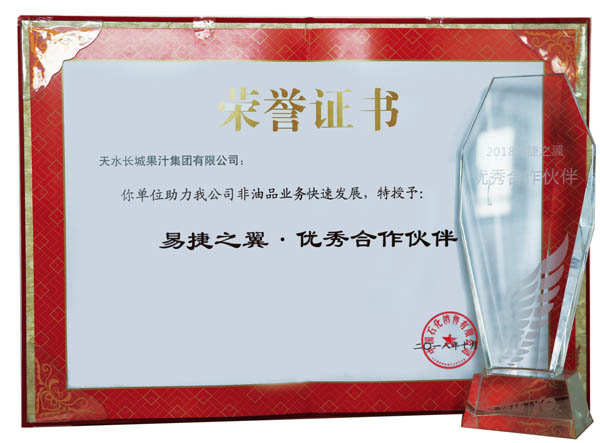 | 长城果汁荣获 “易捷之翼•优秀合作伙伴”荣誉称号 |