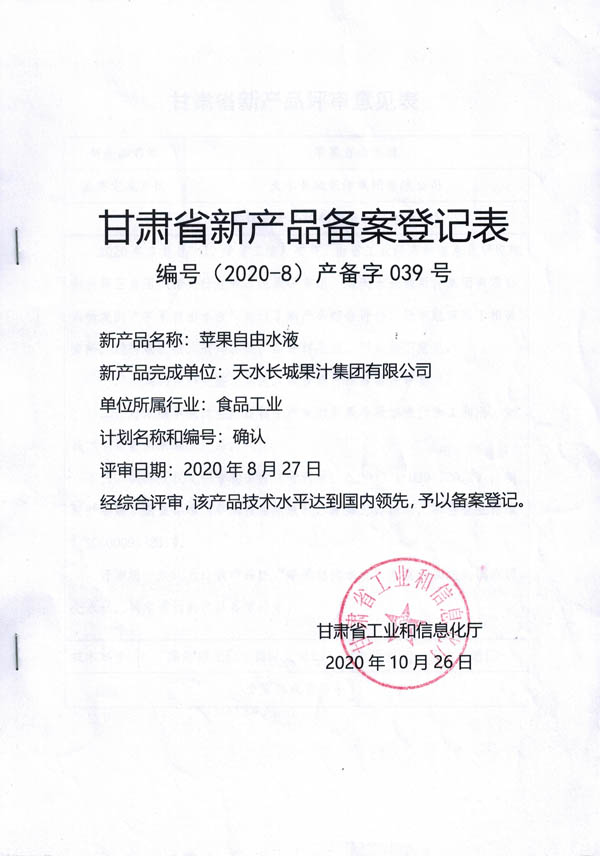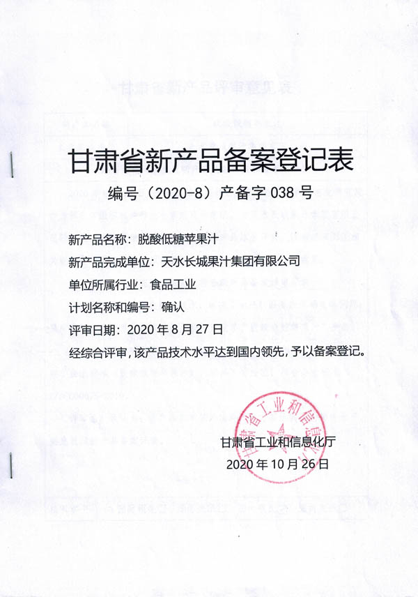2020年8月27日,受省工信厅委托,由省工业经济和信息化研究院作为第三方,在兰州邀请相关行业专家组成评审组,对球友会·体育-球友会(中国)研发的“苹果自由水液”和“脱酸低糖苹果汁”进行了新产品综合评价。