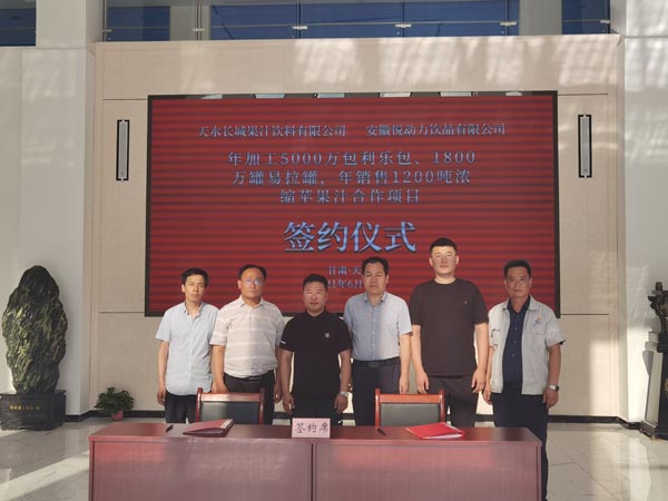 | 我公司与安徽悦动力公司签订年加工5000万利乐包、1800万易拉罐、年供应1200吨浓缩苹果汁合作协议 |