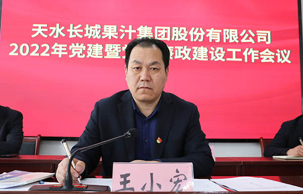 党委书记、董事长王小宏作了题为《坚定不移推改革,凝心聚力促发展,以高质量党建引领开创企业新格局》的党建暨党风廉政建设工作报告,报告总结回顾了2021年党建和党风廉政建设工作,对2022年党建和党风廉政建设的要求及重点任务进行了部署,一是全面加强党的领导,提升公司治理能力和水平;二是全力推动巡察整改,使长城果汁党建工作再上新台阶;三是夯实党建工作基础,全力抓好基层党支部标准化建设;四是强化监督职责,持续加强党风廉政建设工作;五是巩固意识形态阵地建设,加强防范舆情风险和管控力度;六是发挥党支部模范带头作用,全力抓好党建引领生产经营;七是落实人才发展规划,加强高素质干部人才队伍建设;八是发挥党组织总揽全局的领导核心作用,推进企业文化宣传、群团、维稳、安全生产、帮扶和疫情防控等各项工作全面提升。他强调,要坚持以习近平新时代中国特色社会主义思想为指引,坚决贯彻落实中央、省委省政府、省政府国资委和甘肃国投集团党委的决策部署,坚定信心、鼓足干劲、团结一心、勇毅前行,以高质量党建引领保障企业高质量发展。