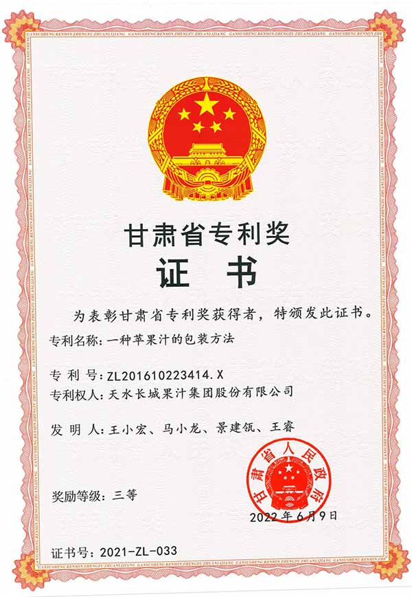 近期,公司的发明专利《一种苹果汁的包装方法》(专利号:ZL201610223414.X)荣获2021年度甘肃省专利奖三等奖。 |