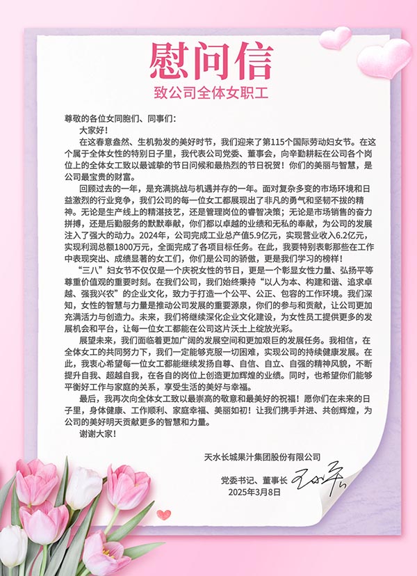 | 党委书记、董事长致公司全体女职工“三八”妇女节的慰问信 |