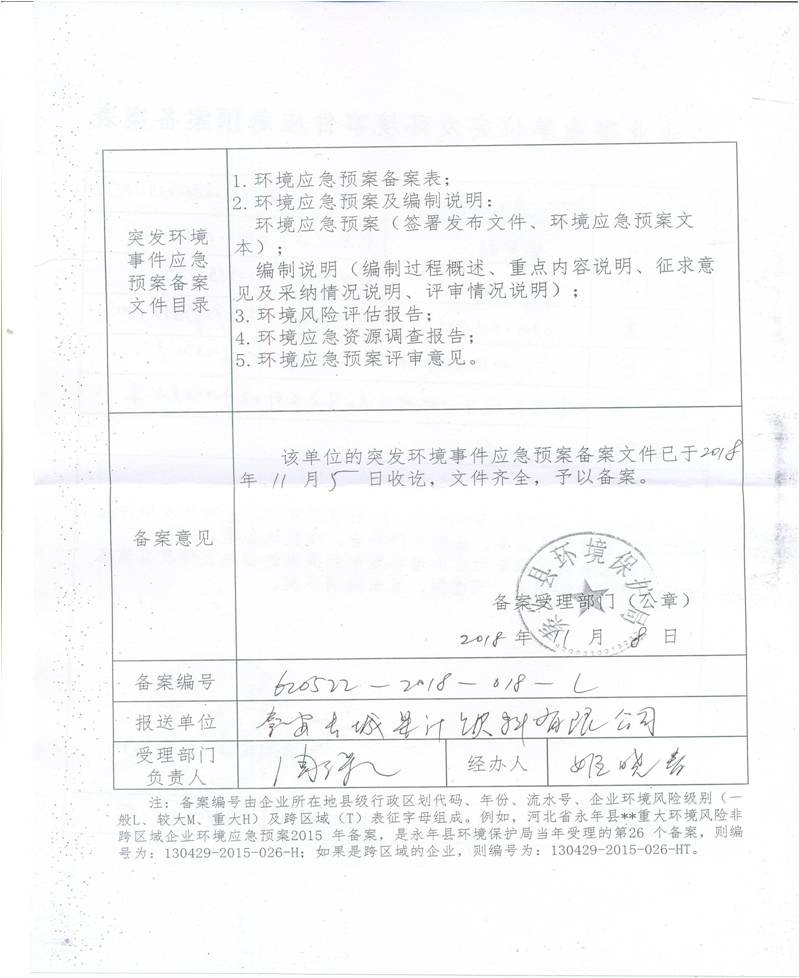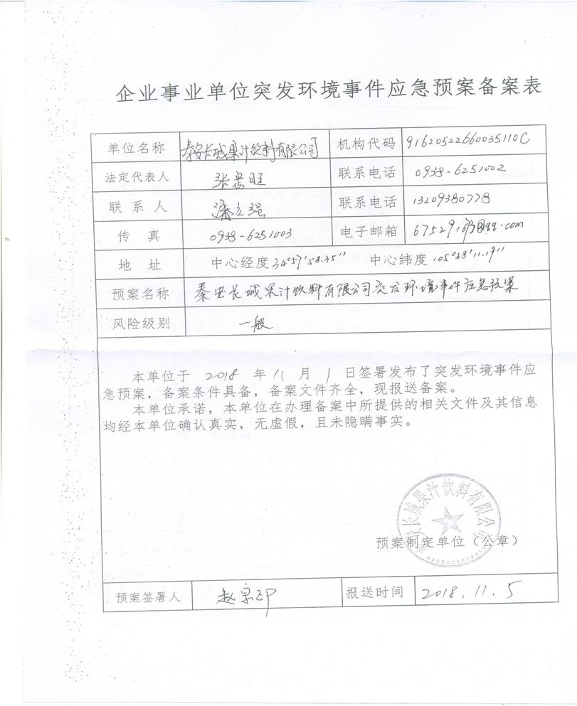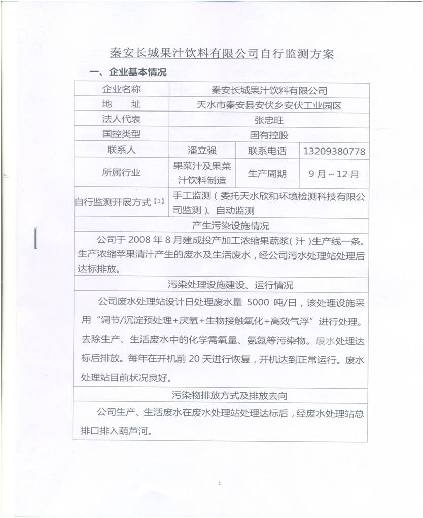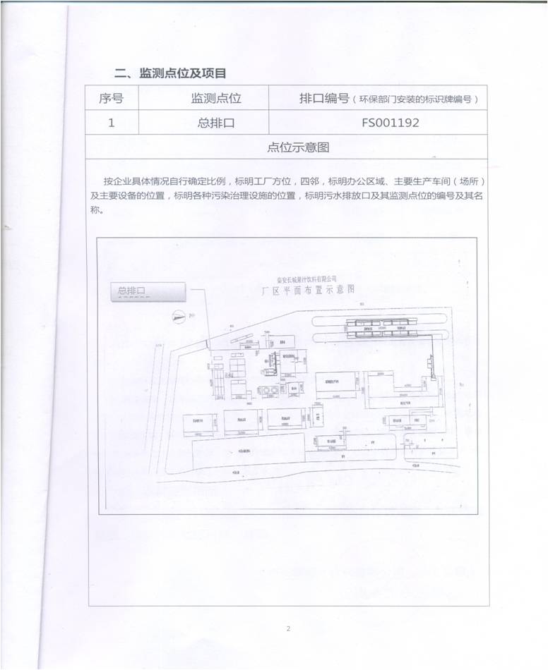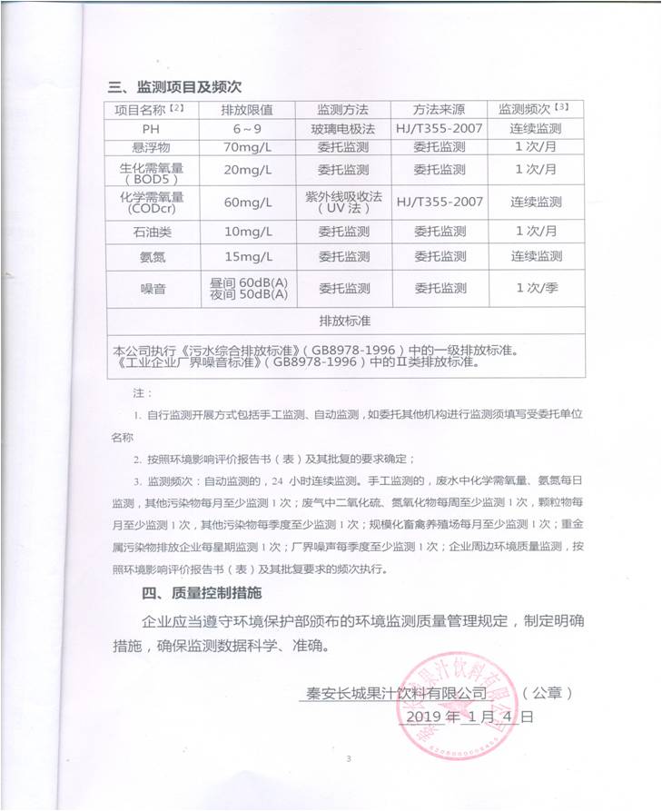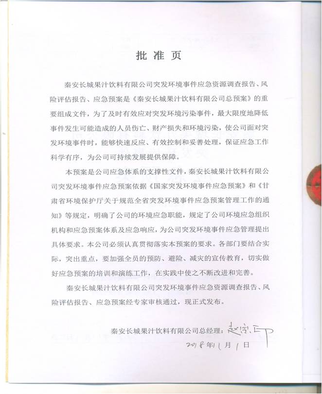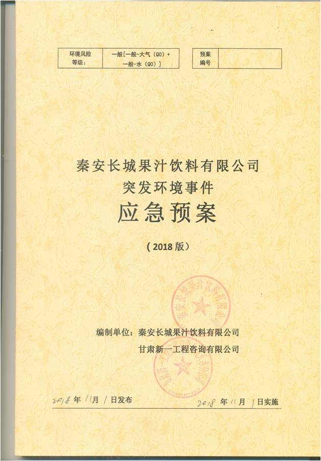 三、 防治污染物设施的建设和运行情况 秦安长城果汁饮料有限公司污水处理站于2008年8月建成使用,2008年11月3日通过环保验收。2010年9月安装了PH、化学需氧量(CODcr)、超声波明渠流量计、数采仪在线传输设备。以上设备在2010年10月通过了环保部门的验收. 2011年9月安装了氨氮在线传输设备,2011年11月通过了环保部门的验收。2014年完成了污水处理站的扩容技术改造。2018年完成了污水提标技术改造项目。 在向相关单位提出污水处理站开机申请经同意后,于2018年9月10日污水处理站开始将处理达标的污水从总排口排放,同时自动监控设备正式运行,数据采集仪正式运行,正式传输污水处理站在线监测数据。2018年11月30日因公司停产没有污水产生,污水处理站停止运行。污水处理站在向相关单位提出申请经同意后,自动监控设备正式停止运行,数据采集仪正式停止运行,正式停止传输污水站在线监测数据。 四、建设项目环境影响评价及其他环境保护行政许可情况 1、环评批复文件: 甘肃省环境保护局 关于天水长城果汁饮料有限公司浓缩果蔬浆(汁)20t/h生线工程(秦安公司)审批意见。 2004年10月18日。 2、环境保护行政主管部门同意试生产批复文件: 1)省管开发建设项目环保验收监测任务通知单。 2008年10月24日。 2)关于天水长城果汁饮料有限公司浓缩果蔬浆(汁)20t/h生产线工程(秦安公司)竣工环境保护验收监测方案的批复。 2008年11月3日。 3、建设项目竣工环境保护验收意见: 《秦安长城果汁饮料有限公司浓缩果蔬浆(汁)20t/h生产线工程环境保护验收意见》,甘肃省环境保护厅,(甘环验【2009】28号文件),验收时间:2009年11月3日。 4、国家重点监控企业在线自动监测验收表: 1)在线监测设备比对验收监测报告。2010年10月16日。 2)国控企业污染源自动监测设备比对监测结果表。 2010年10月16日 5、2014年秦安长城果汁饮料有限公司污水处理扩容改造项目验收意见 1)、天水市环境保护局委托秦安县环境保护局对秦安长城果汁饮料有限公司污水处理扩容改造项目进行竣工环境保护验收的函,(天环函发【2014】172号)。 2)、秦安县环境保护局关于秦安长城果汁饮料有限公司污水处理扩容技术改造项目竣工环境保护验收的意见,(秦环函发【2014】81号)。 6、2018年秦安长城果汁饮料有限公司污水处理提标改造项目备案及环评批复 1)、秦安县发展和改革局关于秦安长城果汁饮料有限公司污水处理提标改造项目备案登记的通知,(秦发改备【2018】113号)。 2)、秦安县环境保护局关于秦安长城果汁饮料有限公司污水处理提标改造项目环境影响报告表的批复,(秦环函发【2018】4号)。 五、突发环境事件应急预案