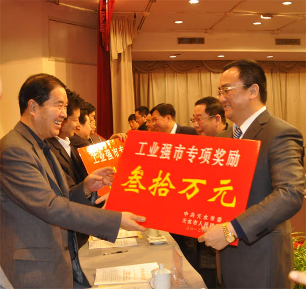 长城电工天水二一三电器有限公司总经理刘胜上台领奖 其中,长开厂公司、二一三公司获“10强50户”企业纳税奖励、天水市工业企业2011年度生产经营上台阶奖励、名牌品牌奖励、技术创新等多项奖励;长城电工天水长城开关厂有限公司获得85万元奖励,天水二一三电器有限公司获得75.4万元奖励,天水长城果汁集团有限公司获得30万元奖励,天水长城控制电器有限责任公司获得11.4万元奖励、天水电气传动研究所有限责任公司获得11万元奖励。