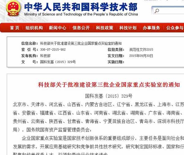 2015年10月14日,国家科技部批准第三批企业国家重点实验室的建设,长城电工天水电气传动研究所有限责任公司 “大型电气传动系统与装备技术国家重点实验室”名列其中。