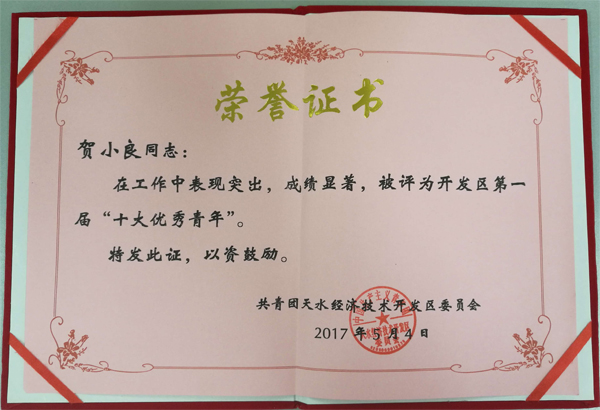 | 长城电工二一三公司贺小良荣获开发区第一届“十大优秀青年”称号 |