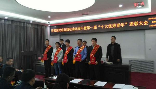 (左二为贺小良) 近日,在天水经济技术开发区团委开展的开发区第一届“十大优秀青年”评选活动中,长城电工天水二一三电器有限公司新能源电器公司技术开发部副部长贺小良同志因其突出的工作业绩和优秀的表现,被评为开发区第一届“十大优秀青年”称号。 5月4日,在天水经济技术开发区团委召开的表彰大会上受到表彰。