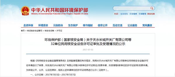 近日,从中华人民共和国环境保护部网站获悉,长城电工天水长城开关厂有限公司向国家环境保护部(国家核安全局)申报的核电1E级“民用核安全设备设计制造许可证”取证申请已通过环境保护部(国家核安全局)审查、审批和公示。标志着长开厂公司具备向国家核电站提供民用核安全设备的资格和能力,取得了进入核电市场领域的“金钥匙”。 |