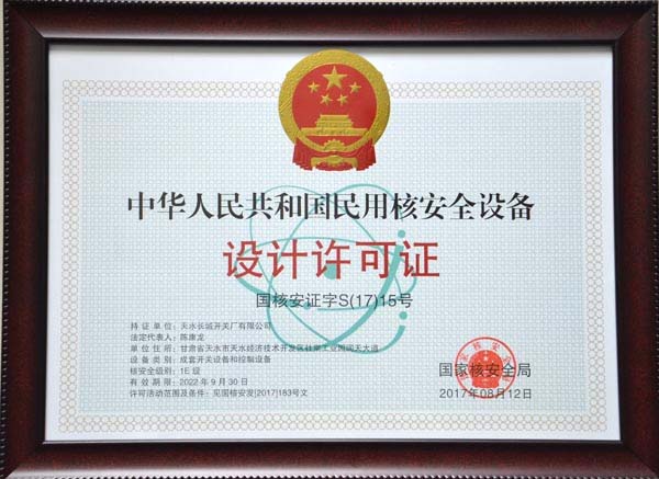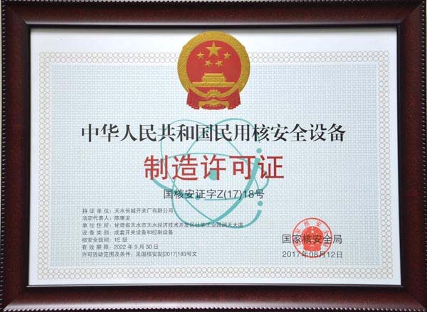 | 长城电工长开厂公司获得国家核安全局颁发的民用核安全设备设计制造许可证 |