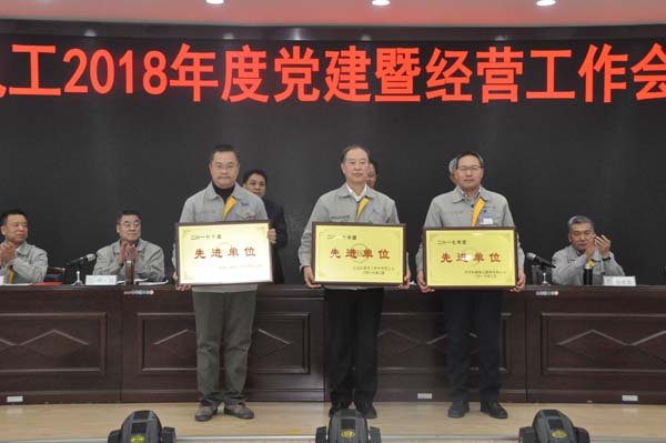 (二一三公司党委书记、董事长何建文做交流发言) 会议还签订了2018年经营目标责任书和安全生产目标责任书;对2017年度取得优异成绩的3个先进单位、2个安全生产先进单位、27个先进集体、36名先进个人进行了表彰奖励;先进单位天传所公司、物流公司和二一三公司向大会分别进行了大会交流发言。