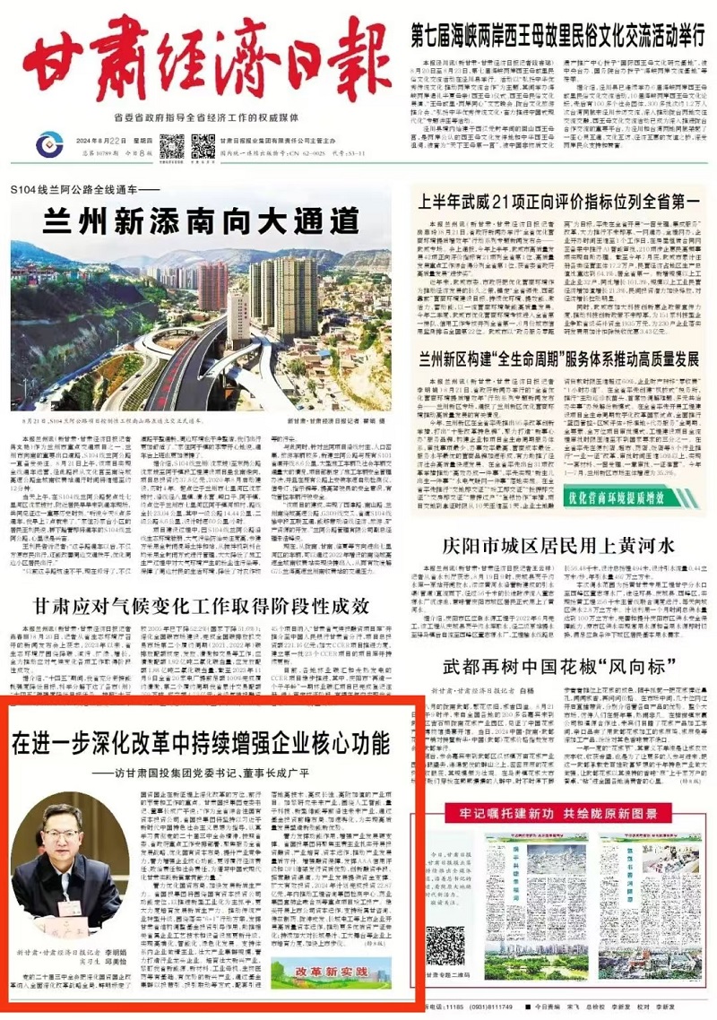 今日出版的甘肃经济日报头版刊登《在进一步深化改革中持续增强企业核心功能——访甘肃国投集团党委书记、董事长成广平》的报道。